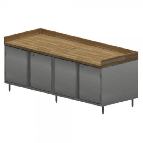 BK Resources, CMBT-3696HL, Chef Table, cabinet base with hinged doors & locks, 96"W x 36"D x 39"H overall size, 1-3/4" thick Hard Maple Bakers Top with 4" coved riser on back and sides, 18/304 stainless steel body, center mullion, (2) sets of hinged doors with locks, enclosed with stainless steel panels on sides and rear, 6” stainless steel legs with 1" height adjustment, stainless steel feet, NSF (3-10 day lead time)