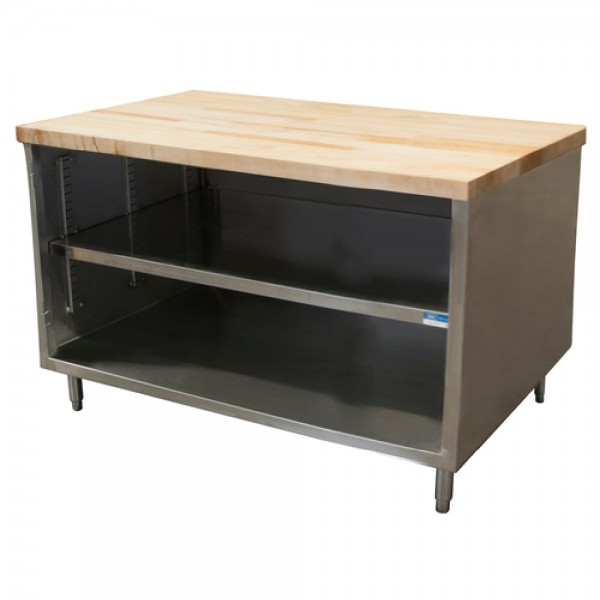 BK Resources, CMT-3048, Chef Table, cabinet base with open front, 48"W x 30"D x 34-3/4"H overall size, 1-3/4" thick hard maple flat top with penetrating oil finish, 18/304 stainless steel body, enclosed with stainless steel panels on sides and rear, 6” stainless steel legs with 1" height adjustment, stainless steel feet, NSF