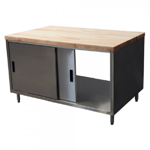 BK Resources, CMT-3048S2, Dual Access Chef Table, cabinet base with sliding doors on both sides, 48"W x 30"D x 34-3/4"H overall size, 1-3/4" thick hard maple flat top with penetrating oil finish, 18/304 stainless steel body, (1) set of sliding doors on each side, 6” stainless steel legs with 1" height adjustment, stainless steel feet, NSF (3-10 day lead time)