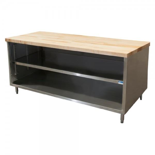BK Resources, CMT-3072, Chef Table, cabinet base with open front, 72"W x 30"D x 34-3/4"H overall size, 1-3/4" thick hard maple flat top with penetrating oil finish, 18/304 stainless steel body, enclosed with stainless steel panels on sides and rear, 6” stainless steel legs with 1" height adjustment, stainless steel feet, NSF