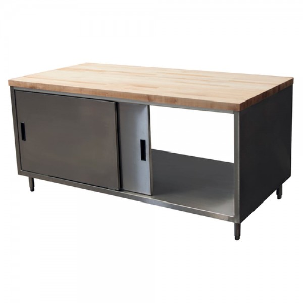 BK Resources, CMT-3072S2, Dual Access Chef Table, cabinet base with sliding doors on both sides, 72"W x 30"D x 34-3/4"H overall size, 1-3/4" thick hard maple flat top with penetrating oil finish, 18/304 stainless steel body, (1) set of sliding doors on each side, 6” stainless steel legs with 1" height adjustment, stainless steel feet, NSF (3-10 day lead time)