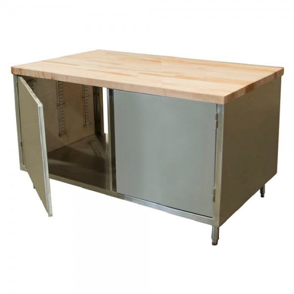BK Resources, CMT-3648H2, Dual Access Chef Table, cabinet base with hinged doors on both sides, 48"W x 36"D x 34-3/4"H overall size, 1-3/4" thick hard maple flat top with penetrating oil finish, 18/304 stainless steel body, (1) set of hinged doors on each side, 6” stainless steel legs with 1" height adjustment, stainless steel feet, NSF (3-10 day lead time)