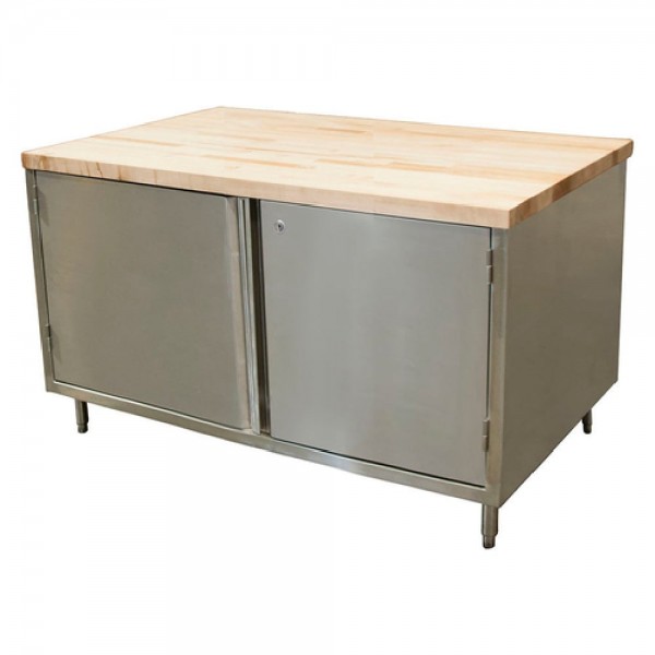 BK Resources, CMT-3648HL, Chef Table, cabinet base with hinged doors & lock, 48"W x 36"D x 34-3/4"H overall size, 1-3/4" thick hard maple flat top with penetrating oil finish, 18/304 stainless steel body, (1) set of hinged doors with lock, 6” stainless steel legs with 1" height adjustment, stainless steel feet, NSF (3-10 day lead time)
