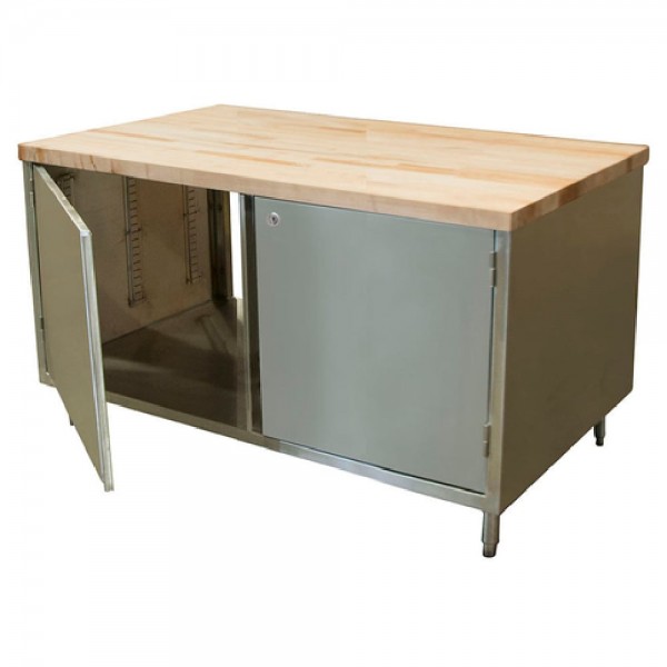 BK Resources, CMT-3660HL2, Dual Access Chef Table, cabinet base with hinged doors & lock on both sides, 60"W x 36"D x 34-3/4"H overall size, 1-3/4" thick hard maple flat top with penetrating oil finish, 18/304 stainless steel body, (1) set of hinged doors with lock on each side, 6” stainless steel legs with 1" height adjustment, stainless steel feet, NSF (3-10 day lead time)