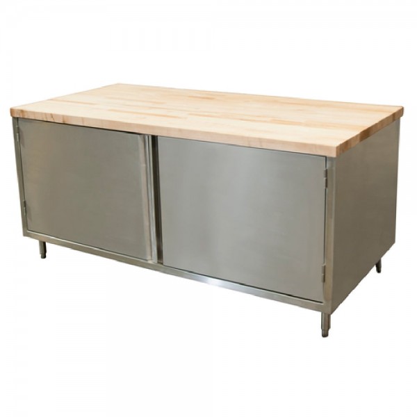 BK Resources, CMT-3672H, Chef Table, cabinet base with hinged doors, 72"W x 36"D x 34-3/4"H overall size, 1-3/4" thick hard maple flat top with penetrating oil finish, 18/304 stainless steel body, (1) set of hinged doors, 6” stainless steel legs with 1" height adjustment, stainless steel feet, NSF (3-10 day lead time)