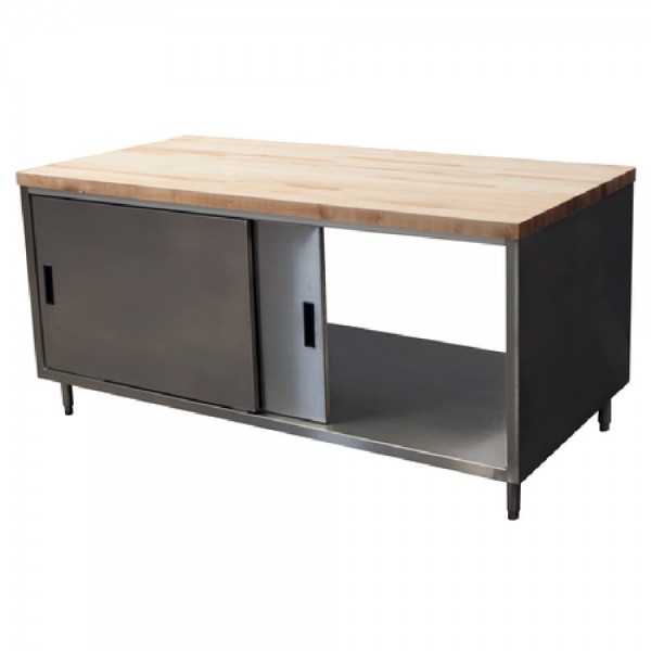 BK Resources, CMT-3672S2, Dual Access Chef Table, cabinet base with sliding doors on both sides, 72"W x 36"D x 34-3/4"H overall size, 1-3/4" thick hard maple flat top with penetrating oil finish, 18/304 stainless steel body, (1) set of sliding doors on each side, 6” stainless steel legs with 1" height adjustment, stainless steel feet, NSF (3-10 day lead time)
