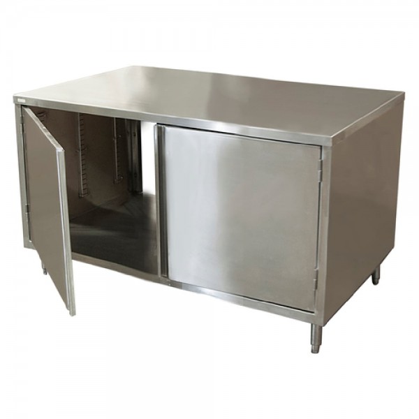 BK Resources, CST-2418H2, Dual Access Chef Table, cabinet base with hinged doors on both sides, 18"W x 24"D x 34-3/4"H overall size, 14/304 stainless steel top, 18/304 stainless steel body, (1) set of doors on each side, 6” stainless steel legs with 1" height adjustment, stainless steel feet, NSF (3-10 day lead time)