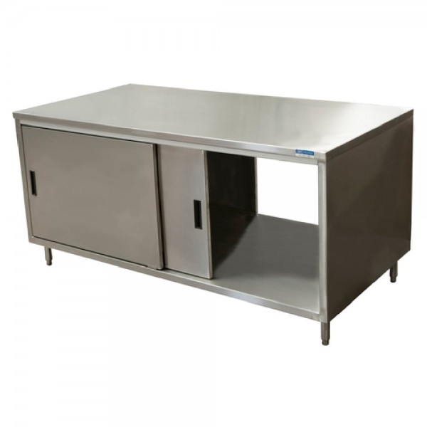 BK Resources, CST-2472S2, Dual Access Chef Table, cabinet base with sliding doors on both sides, 72"W x 24"D x 34-3/4"H, 14/304 stainless steel top, 18/304 stainless steel body, (1) set of doors on each side, 6” stainless steel legs with 1" height adjustment, stainless steel feet, NSF (3-10 day lead time)