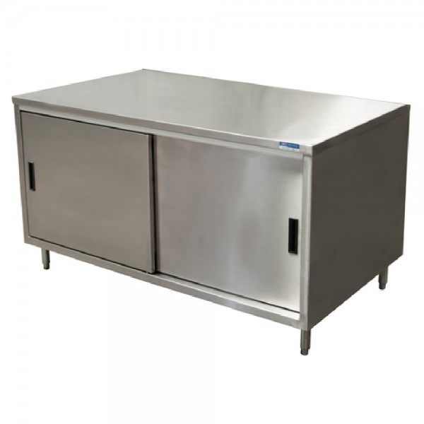 BK Resources, CST-3036S2, Dual Access Chef Table, cabinet base with sliding doors on both sides, 36"W x 30"D x 34-3/4"H, 14/304 stainless steel top, 18/304 stainless steel body, (1) set of doors on each side, 6” stainless steel legs with 1" height adjustment, stainless steel feet, NSF (3-10 day lead time)