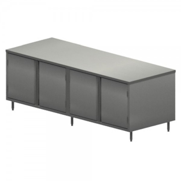 BK Resources, CST-3096H2, Dual Access Chef Table, cabinet base with hinged doors on both sides, 96"W x 30"D x 34-3/4"H overall size, 14/304 stainless steel top, 18/304 stainless steel body, center mullion, (2) sets of doors on each side, 6” stainless steel legs with 1" height adjustment, stainless steel feet, NSF (3-10 day lead time)