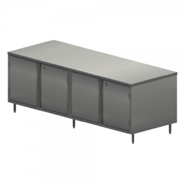 BK Resources, CST-3096HL, Chef Table, cabinet base with hinged doors & locks, 96"W x 30"D x 34-3/4"H overall size, 14/304 stainless steel top, 18/304 stainless steel body, center mullion, (2) sets of hinged doors with locks, 6" stainless steel legs with 1" height adjustment, stainless steel feet, NSF (3-10 day lead time)