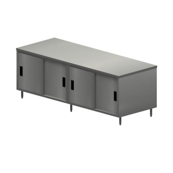 The 18/304 stainless steel body and center mullion give this chef table a sturdy and long-lasting build, while the sliding doors provide easy access to your kitchen tools and accessories. Equipped with (2) sets of doors, this chef table allows for convenient storage of all your culinary essentials, keeping your workspace neat and organized. The 6” stainless steel legs come with 1" height adjustment, allowing for easy customization to suit your specific requirements.