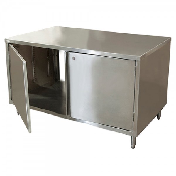 BK Resources, CST-3660HL2, Dual Access Chef Table, cabinet base with hinged doors & locks on both sides, 60"W x 36"D x 34-3/4"H overall size, 14/304 stainless steel top, 18/304 stainless steel body, (1) set of doors with locks on each side, 6” stainless steel legs with 1" height adjustment, stainless steel feet, NSF (3-10 day lead time)