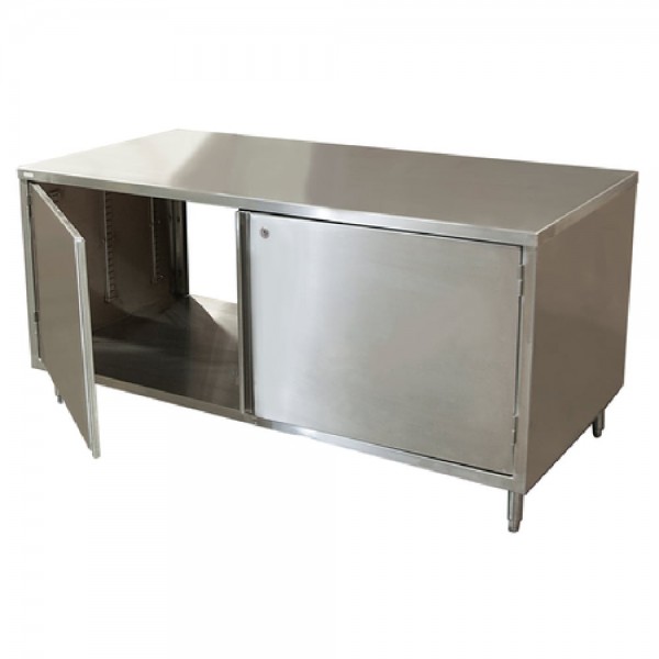 BK Resources, CST-3672HL2, Dual Access Chef Table, cabinet base with hinged doors & locks on both sides, 72"W x 36"D x 34-3/4"H overall size, 14/304 stainless steel top, 18/304 stainless steel body, (1) set of doors with locks on each side, 6” stainless steel legs with 1" height adjustment, stainless steel feet, NSF (3-10 day lead time)