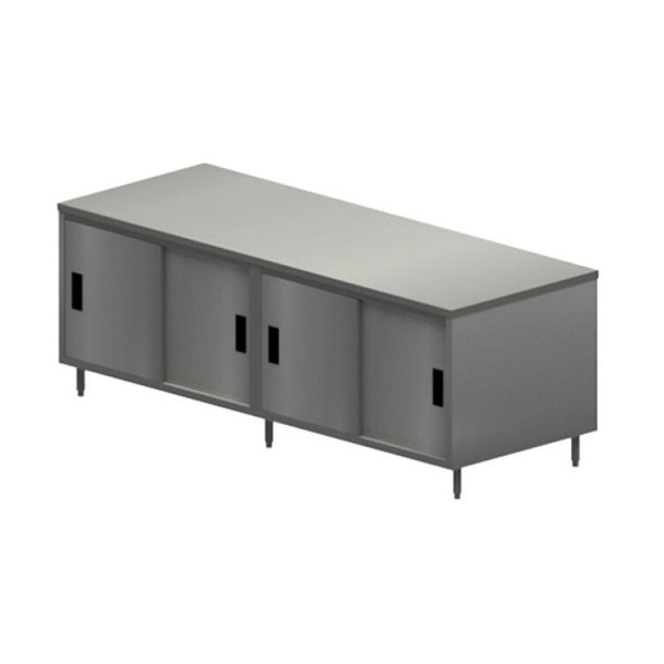 BK Resources, CST-3684S, Chef Table, cabinet base with sliding doors, 84"W x 36"D x 34-3/4"H overall size, 14/304 stainless steel top, 18/304 stainless steel body, (1) set of doors, 6” stainless steel legs with 1" height adjustment, NSF (3-10 day lead time)