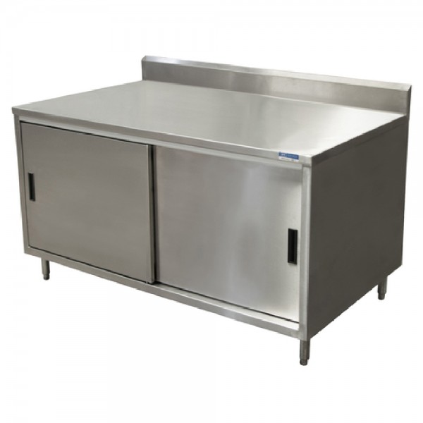 BK Resources, CSTR5-3036S, Chef Table, cabinet base with sliding doors, 36"W x 30"D x 39-3/4"H overall size, 14/304 stainless steel to, with 5" back riser, 18/304 stainless steel body, (1) set of doors, 6” stainless steel legs with 1" height adjustment, stainless steel feet, NSF (3-10 day lead time)