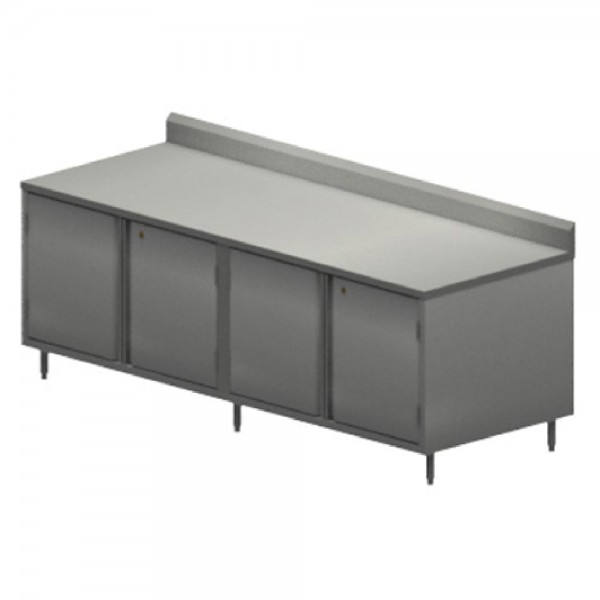 BK Resources, CSTR5-3096HL, Chef Table, cabinet base with hinged doors & locks, 96"W x 30"D x 39-3/4"H overall size, 14/304 stainless steel top with 5" back riser, 18/304 stainless steel body, center mullion, (2) sets of doors with locks, 6” stainless steel legs with 1" height adjustment, stainless steel feet, NSF (3-10 day lead time)