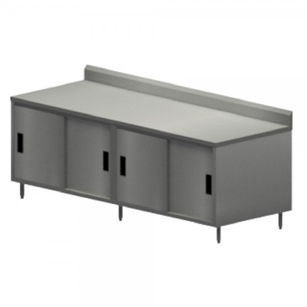 BK Resources, CSTR5-3096S, Chef Table, cabinet base with sliding doors, 96"W x 30"D x 39-3/4"H overall size, 14/304 stainless steel top with 5" back riser, 18/304 stainless steel body, center mullion, (2) sets of doors, 6” stainless steel legs with 1" height adjustment, stainless steel feet, NSF (3-10 day lead time)