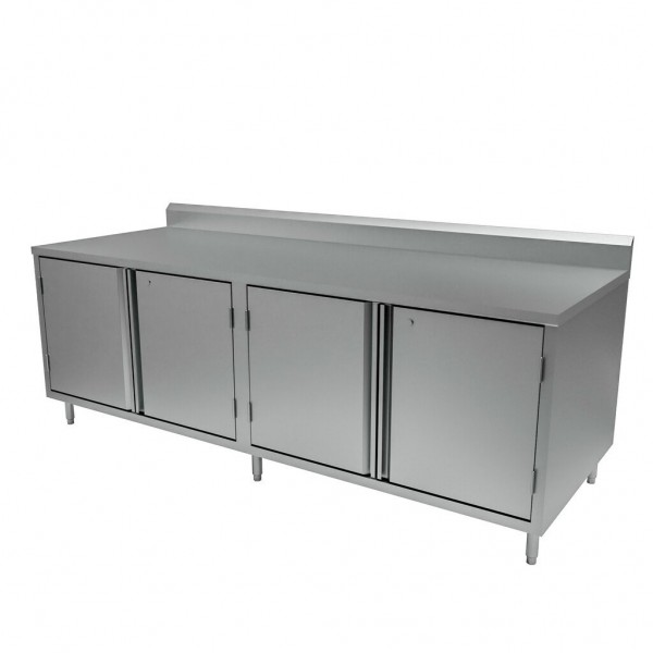 BK Resources, CSTR5-36120HL, Chef Table, cabinet base with hinged doors & locks, 120"W x 36"D x 39-3/4"H overall size, 14/304 stainless steel top with 5" back riser, 18/304 stainless steel body, center mullion, (2) sets of doors with locks, 6” stainless steel legs with 1" height adjustment, stainless steel feet, NSF (3-10 day lead time)