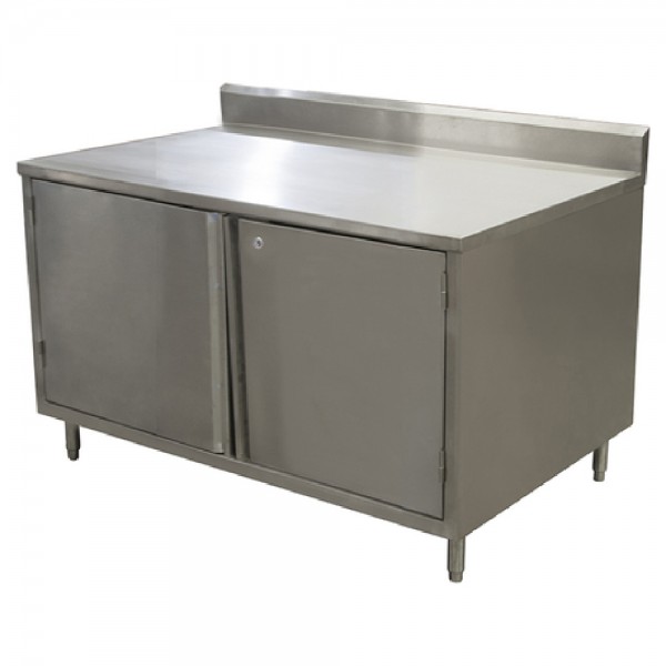 BK Resources, CSTR5-3660HL, Work Table, cabinet base with hinged doors & locks, 60"W x 36"D x 39-3/4"H overall size, 14/304 stainless steel top with 5" back riser, 18/304 stainless steel body, (1) set of hinged doors with lock, 6" stainless steel adjustable legs, NSF (3-10 day lead time)