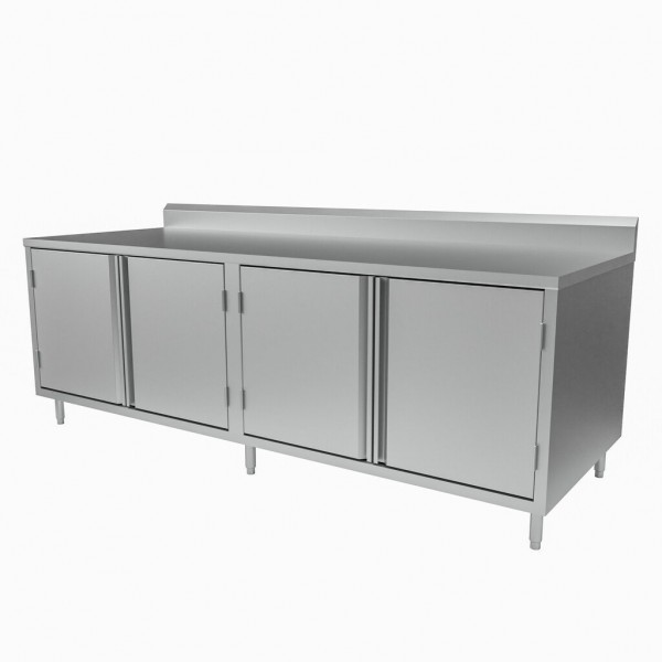 BK Resources, CSTR5-3684H, Work Table, cabinet base with hinged doors, 84"W x 36"D x 39-3/4"H overall size, 14/304 stainless steel top with 5" back riser, 18/304 stainless steel body, (1) set of hinged doors, 6" stainless steel adjustable legs, NSF (3-10 day lead time)