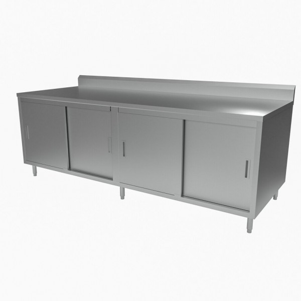 BK Resources, CSTR5-3684S, Chef Table, cabinet base with sliding doors, 84"W x 36"D x 39-3/4"H overall size, 14/304 stainless steel top with 5" back riser, 18/304 stainless steel body, (1) set of doors, 6” stainless steel legs with 1" height adjustment, stainless steel feet, NSF (3-10 day lead time)