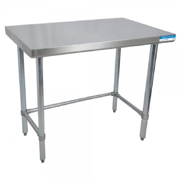 BK Resources, CTTOB-3030, Work Table, 30"W x 30"D x 34-3/4"H overall size, 16/304 stainless steel flat top, reinforced with (2) 5" C channels, open base with galvanized side & rear bracing, (4) 1-5/8" dia. galvanized legs, adjustable high-impact, corrosion-resistant feet, NSF, KD