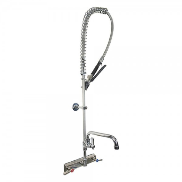 BK Resources, EVO-8SMPR-AF12, Evolution Pre-Rinse Assembly with add-on faucet, splash mount, 8" OC, add-on faucet with 12" swing spout, 12" wall bracket, 1/4 turn ceramic cartridges, integral check valves, color coded hot & cold indicators, stainless steel dual pattern spray head, stainless steel faucet base waterways, 1/2" female inlets