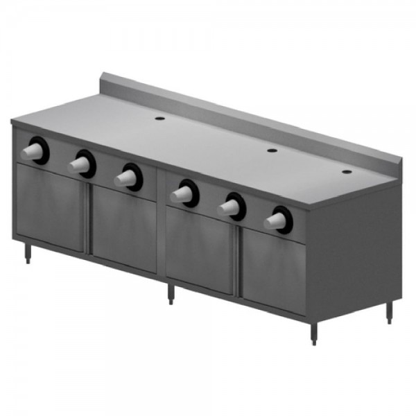 BK Resources, MOD-BEVT, Convenience Store Table, cabinet base with hinged doors, 96"W x 30"D x 39-3/4"H, includes: (1) CSTR5-3096 cabinet with 5" riser, (2) EM-14G Fascia, (3) EM-19 cord grommets, (6) EM-26 cup dispensers, 14/304 stainless steel top, 18/304 stainless steel body, adjustable legs