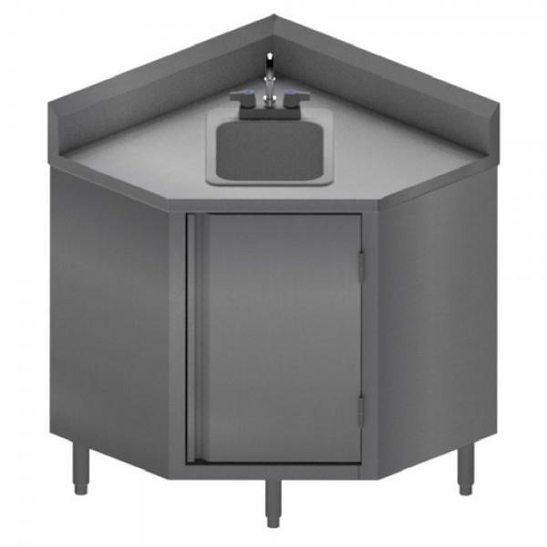 BK Resources, MOD-CC-2HL, Corner Cabinet Base Work Table with Hinged Door & Lock and Drop-In Sink, 30" x 30", 5" riser top, includes: (1) BK-DIS-1014-10-P-G drop-in hand sink with side splashes, (1) EM-3 cut out & install of sink, 14/304 stainless steel top, 18/304 stainless steel body, adjustable legs