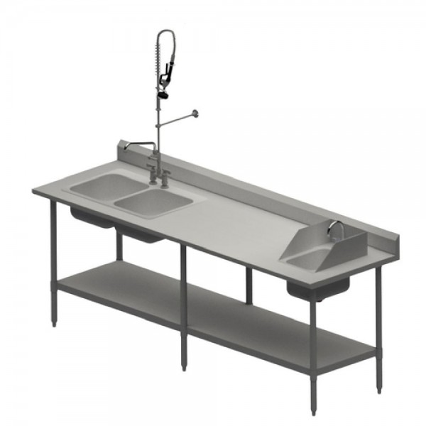 BK Resources, MOD-PT, Work Table with Prep & Hand Sinks, 96"W x 30"D, includes: (1) CVTR5-9630 work table with undershelf, (1) DDI2-14161024 two-compartment sink, (1) BKF-4HDDPR-WB-G pre-rinse assembly with 10" add-on faucet & wall bracket, & (1) DDI-10141024S-P-G, hand sink with faucet & side splashes, 16/304 stainless steel top, stainless steel adjustable legs & feet