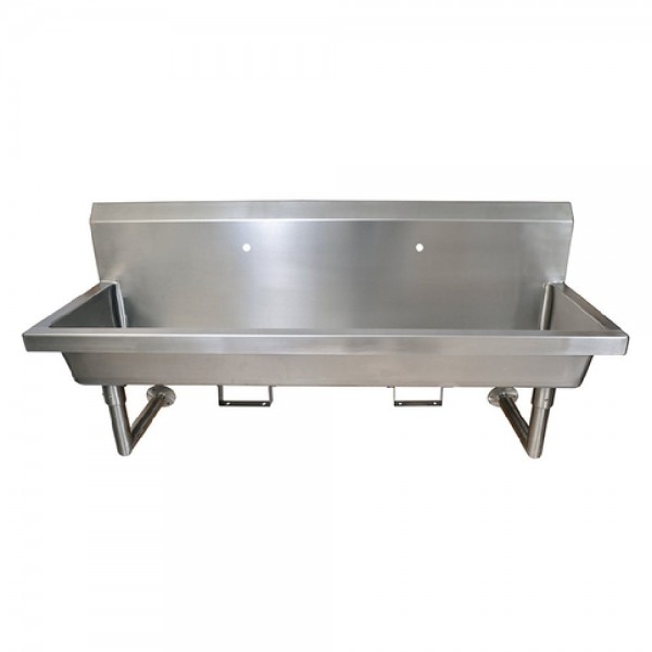 BK Resources, MSHS-60W1B, Two Station Handwash Sink, wall mounted, (2) single hole splash mount faucet holes, 60"W x 19-7/8" front-to-back x 8" deep bowl, knee valve bracket, 14/304 stainless steel sink, basket drain, 18 gauge stainless steel legs & supports, NSF (3-5 day lead time)