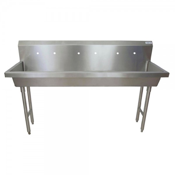 BK Resources, MSHS-72F2, Three Station Handwash Sink, freestanding, (3) sets of 8" OC splash mount faucet holes, 72"W x 19-7/8" front-to-back x 8" deep bowl, 14/304 stainless steel sink, basket drain, 18 gauge stainless steel legs & supports, NSF (3-5 day lead time)