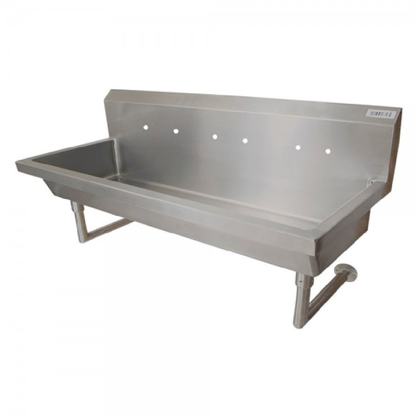 BK Resources, MSHS-72W2, Three Station Handwash Sink, wall mounted, (3) sets of 8" OC splash mount faucet holes, 72"W x 19-7/8" front-to-back x 8" deep bowl, 14/304 stainless steel sink, basket drain, 18 gauge stainless steel legs & supports, NSF (3-5 day lead time)