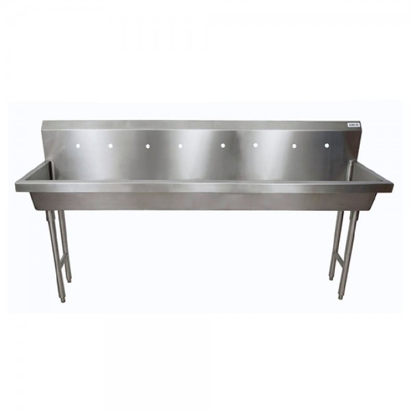 BK Resources, MSHS-96F2, Four Station Handwash Sink, freestanding, (4) sets of 8" OC splash mount faucet holes, 96"W x 19-7/8" front-to-back x 8" deep bowl, 14/304 stainless steel sink, basket drain, 18 gauge stainless steel legs & supports, NSF (3-5 day lead time)