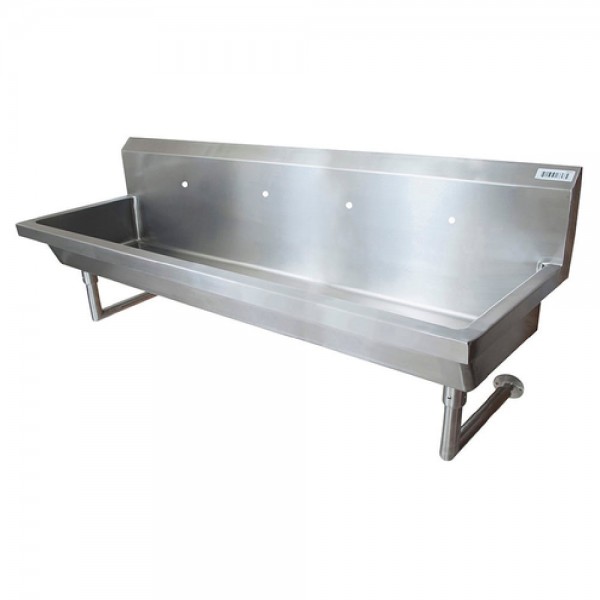 BK Resources, MSHS-96W1, Four Station Handwash Sink, wall mounted, (4) single hole splash mount faucet holes, 96"W x 19-7/8" front-to-back x 8" deep bowl, 14/304 stainless steel sink, basket drain, 18 gauge stainless steel legs & supports, NSF (3-5 day lead time)