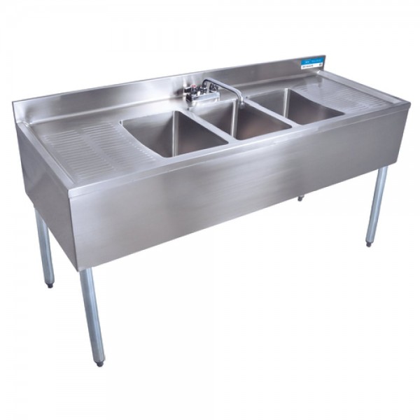 Introducing the BK Resources UB4-18-360TS Slim-Line Underbar Sink - the perfect addition to any commercial food service operation. This three compartment sink boasts an impressive overall size of 60”W x 18-1/4"D x 32-1/2"H, making it a great fit for any bar or restaurant. The sink's compartments are 10" wide, 14" front-to-back, and 10" deep, providing ample space for washing and rinsing dishes. Featuring two stamped drainboards, one on each side, this sink is designed to keep your workspace organized and clean.