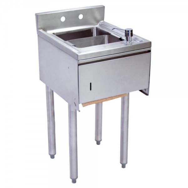 BK Resources, UB4-21-1012HST-15-PG, Underbar Dump Sink, 15"W x 21-1/4"D x 32-1/2"H overall size, 12" front-to-back compartment, 4"H backsplash, 4" OC includes: splash mount faucet (BKF-W2-3G-G, strainer basket, soap dispenser (BK-UCSD-1), basket drain (BKDR-2) & towel dispenser, 18/304 stainless steel construction, stainless steel legs & bracing, adjustable high impact corrosion resistant feet, NSF