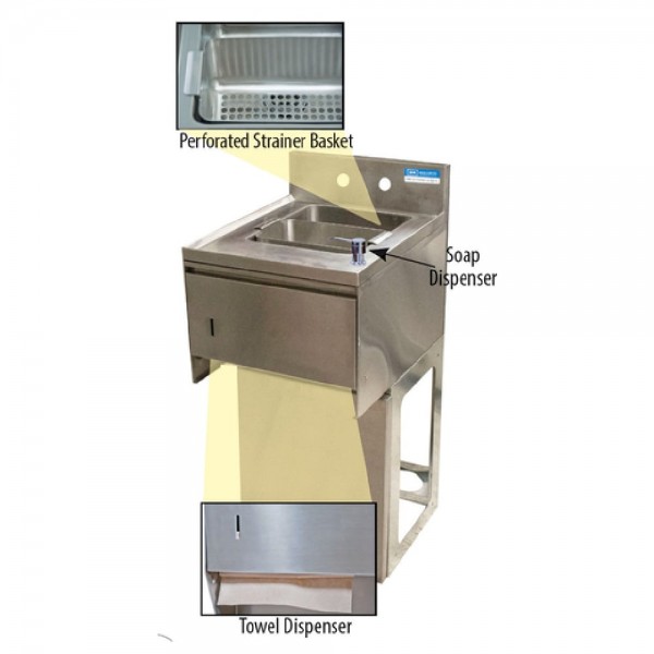 BK Resources, UBB-18-1012HST-12-PG, Slimline Underbar Dump Sink, 12-1/2"W x 18-1/4"D x 33-1/2"H overall size, 12" front-to-back compartment, 4"H backsplash, 4" OC, includes: splash mount faucet (BKF-W2-3G-G), strainer basket, soap dispenser (BK-UCSD-1), basket drain (BKDR-2) & towel dispenser, 18/304 stainless steel construction, pedestal base, NSF