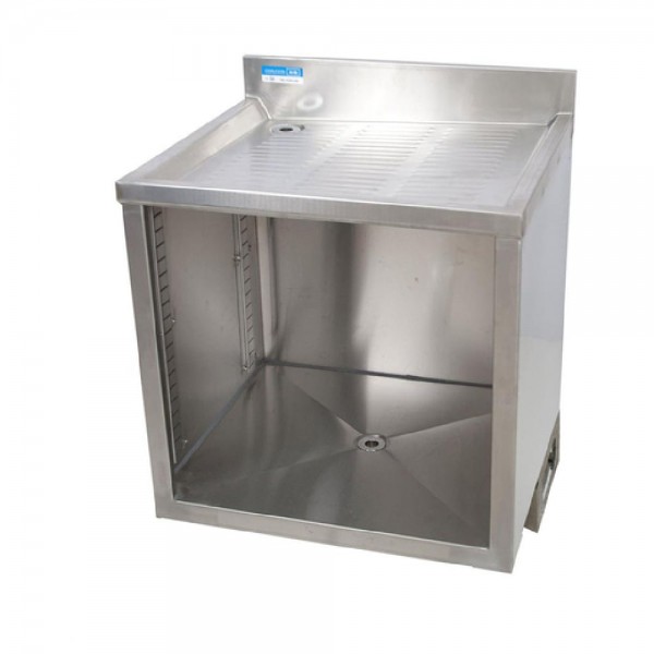BK Resources, UBB-21-GC240, Underbar Glass Rack Unit, drainboard top, 24"W x 21"D x 33-1/2"H, open front base, 18/304 stainless steel top with 3" backsplash & 1" NPS drain (BKDR-15CP), pedestal base, NSF