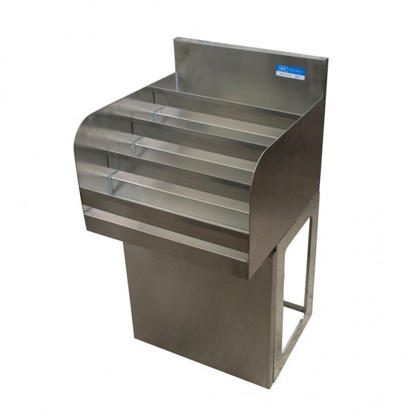 BK Resources, UBB-21-LD24, Underbar Liquor Bottle Display Unit, 24"W X 21-1/4"D x 33-1/2"H, (4) steps with guard rail, approximately (27) bottle capacity, 18/304 stainless steel construction, 1-5/8", diameter pedestal base, NSF