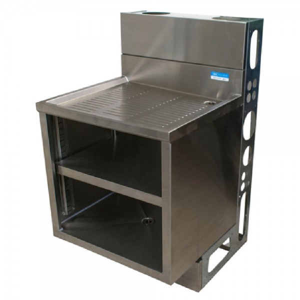 BK Resources, UBDW-21-GC481, Underbar Glass Rack Unit, drainboard top, 48"W x 21"D x 33-1/2"H, open front base, adjustable shelf, 18/304 stainless steel top with 3" backsplash, & 1" NPS drain (BKDR-15CP), die wall and base, NSF