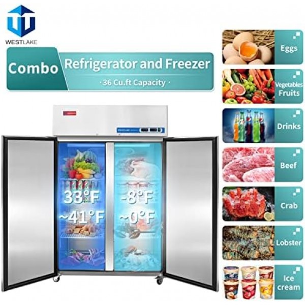 WESTLAKE Commercial Refrigerator and Freezer Combo 48" W 2 door 2 Section Stainless Steel Reach in Solid door Fan Cooling 36 Cu.ft Refrigerator and Freezer Combo for Restuarant, Bar, Shop, etc