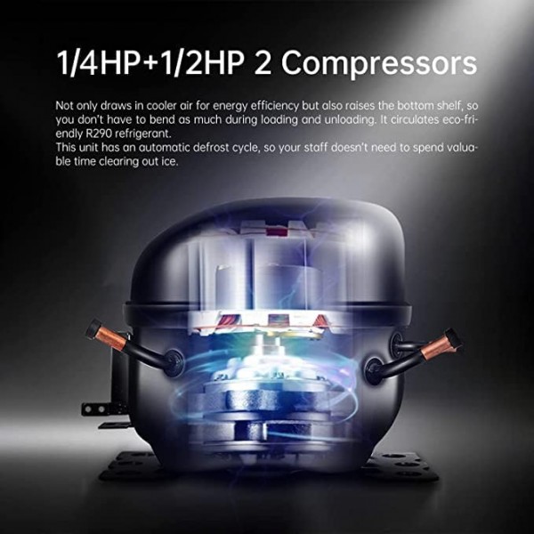 - Powerful compressor: commercial refrigerator and freezer combo with double Cubigel compressor, Carel controller, Fan cooling system, automatically defrost, need no extra tube for condensing water