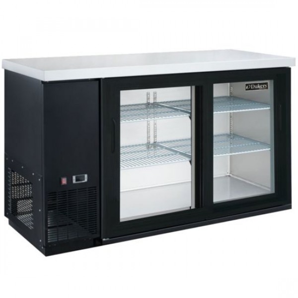 The Dukers DBB60-S2 under bar refrigerator is designed to chill and organize beer, soda, juice, and drink mixers in a convenient space-saving cabinet. Featured in a large 61 in. size and two doors, double pane tempered glass block UV light to safely keep all types of drinks ready to serve. Constructed of commercial-grade body panels in black textured finish to fit all decors and living spaces. Precision digital temperature controls allow pinpoint accuracy with temperatures from 33-38"F. Includes 4 adjustable and removable wire shelves. Uses sliding glass doors.