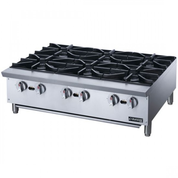 The Dukers DCHPA36 hot plate with 6 burners features 28,000 BTUs and works with natural gas or liquid propane.