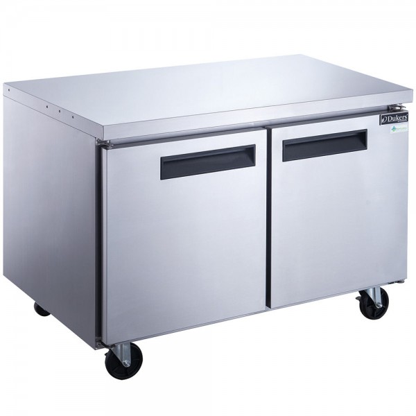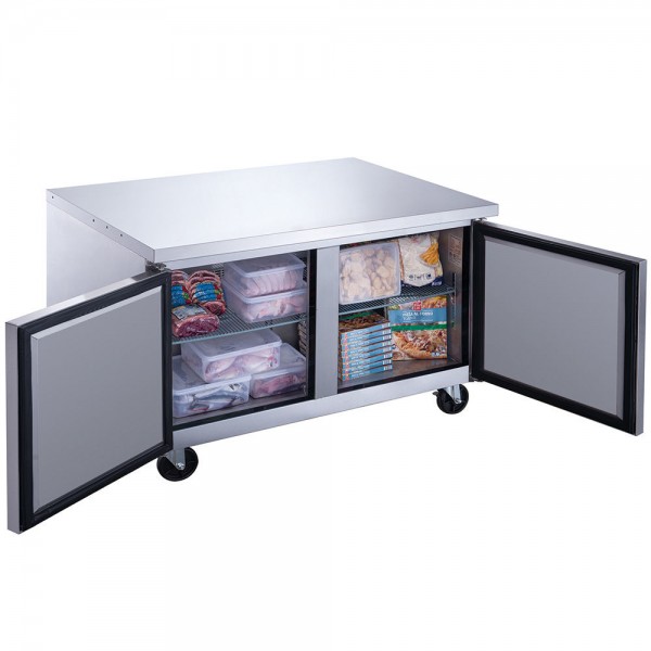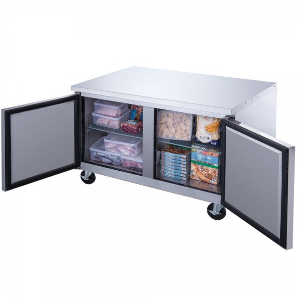 The Dukers DUC60F 60" Two Solid Door Undercounter Worktop Freezer is coated with high quality stainless adjustable shelves, which prevent peel and rust. The back mount compressor structure is placed in the coolest possible area, provides quick and easy service. Digital temperature controls with LED display for precise adjustment and automatic defrosting system. R290 Natural Refrigerant, prometes faster cool down and efficient energy consumption. Stainless steel inside and outside, sealed interior floors and rounder cabinet corners for easy cleaning. Higher Resistance to dust, high quality condenser. Self-closing doors at 60° with stay open feature.