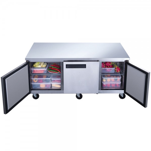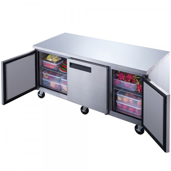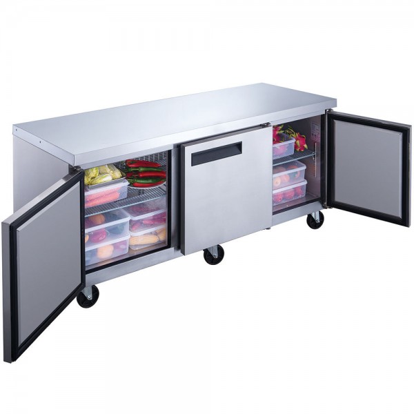 The Dukers DUC72F 72" Triple Solid Door Undercounter Worktop Freezer is coated with high quality stainless adjustable shelves, which prevent peel and rust. The back mount compressor structure is placed in the coolest possible area, provides quick and easy service. Digital temperature controls with LED display for precise adjustment and automatic defrosting system. R290 Natural Refrigerant, prometes faster cool down and efficient energy consumption. Stainless steel inside and outside, sealed interior floors and rounder cabinet corners for easy cleaning. Higher Resistance to dust, high quality condenser. Self-closing doors at 60° with stay open feature.