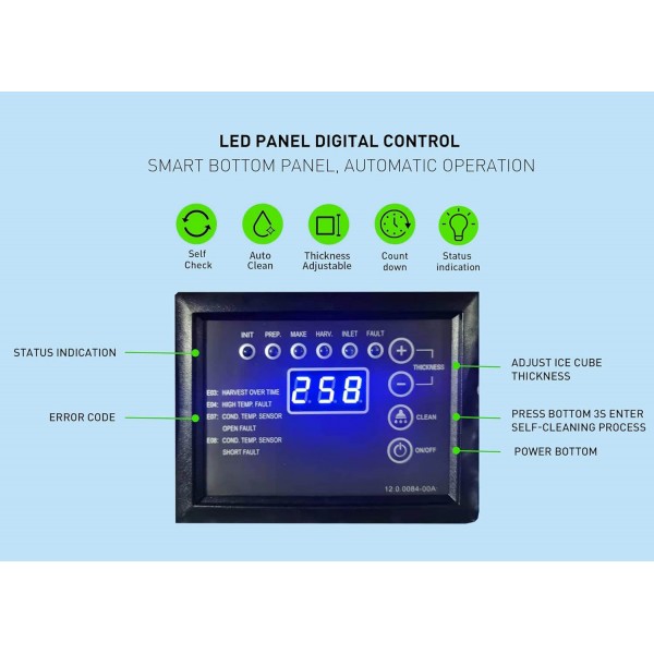 - digital control panel and Intelligent voiced failure function system: The LCD digital display simplifies your operation to the greatest extent so that you can easily adjust the ice making time and ice thickness; Placed in loudspeaker controller board, the sensor transmits ice maker statement and invoiced to the user if any failure