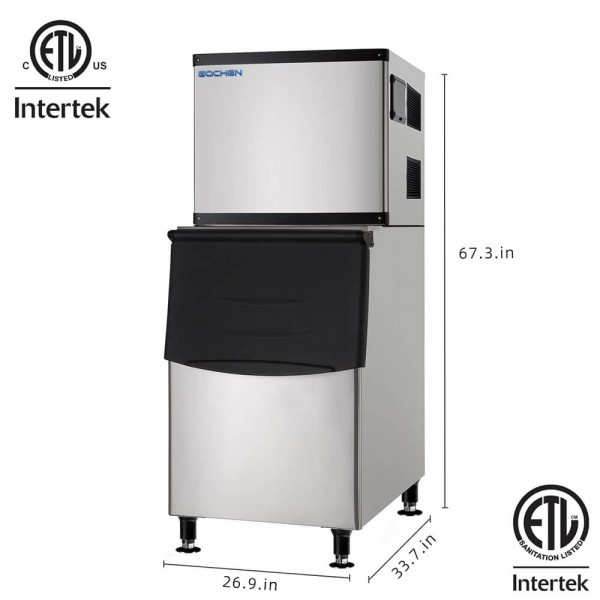 - Efficient ice-making capability: 500lbs/24hours, Storage: 270lbs, Ambient temperature 70℉, water temperature 50℉.A reliable refrigeration system ensures a high-speed and stable refrigerating process, and a reasonable ice-making method ensures high-quality and smooth ice output